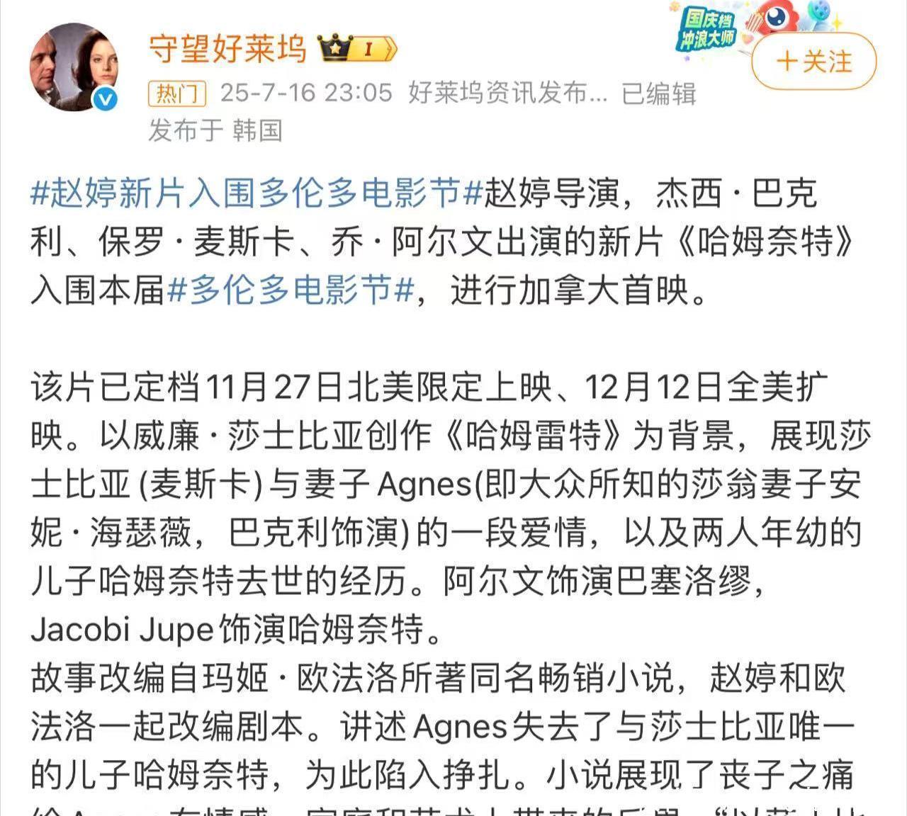 在7月16日的时期,她和几位番邦导演执导的新电影《哈姆奈特》入围了多伦多电影节,到时期在加拿大首映。